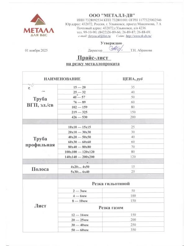 Прайс лист на резку и рубку металла.